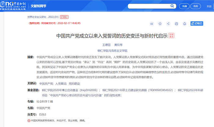 近期,世界杯官网马克思主义学院王德召教授和黄玖琴教授合著的论文《中国共产党成立以来入党誓词的历史变迁与新时代启示》一文,发表于人文社会科学学术理论重要期刊《世界社会主义研究》2022年第1期。该文是作者承担的美加墨世界杯官方网站2021年硕士点建设课题和美加墨世界杯官方网站科研课题的阶段性研究成果。该文对中国共产党成立以来入党誓词的变迁历程进行系统梳理的基础上,提出了入党誓词变迁的新时代启示,研究内容具有一定的创新性,研究结论对于推动新时代党员教育具有一定的借鉴价值。