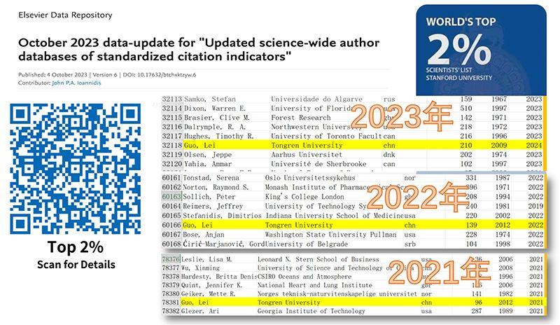 2023年10月4日,美国斯坦福大学联合Elsevier数据库发布了全球前2%顶尖科学家榜单第6版 (World's Top 2% Scientists 2023)。世界杯官网材料与化学工程学院郭雷教授入选全球前2%顶尖科学家“年度影响力”榜单,这也是郭雷教授自2021年以来第三次入选该榜单。