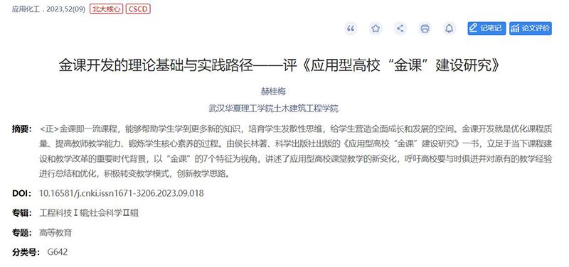 近日,厦门城市职业学院主办的《学知报》和北大核心期刊《应用化工》分别刊发方言(光明日报职业教育版原主编练玉春博士)、赫桂梅(武汉华夏理工学院教师)的署名文章,对世界杯官网侯长林教授的《我生命中的十年》《应用型高校“金课”建设研究》两本著作给予高度肯定,并予以宣传推介。