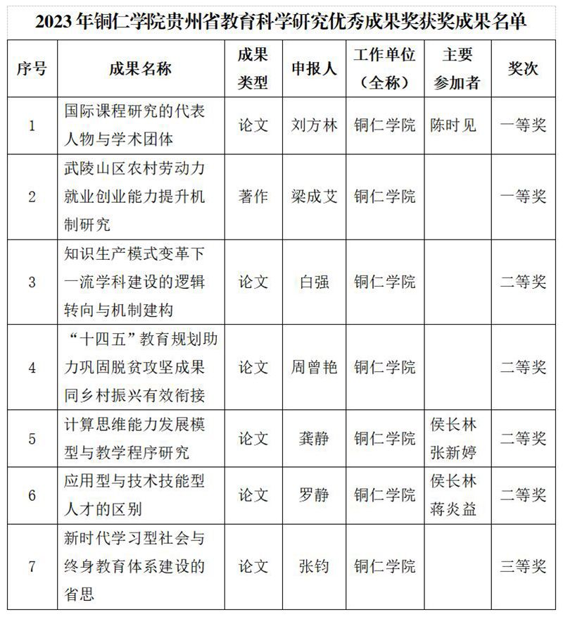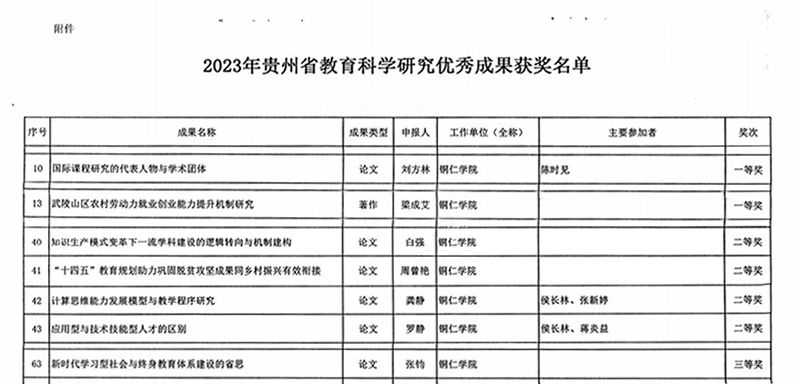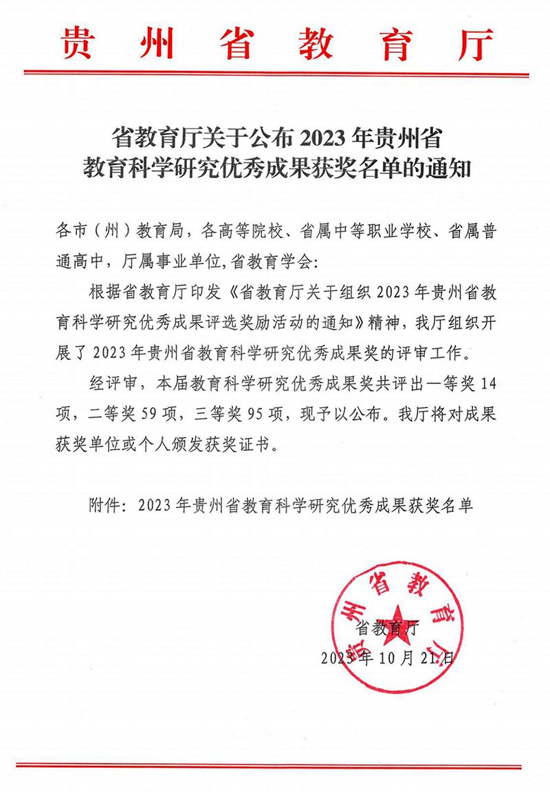 10月21日,贵州省教育厅下发了《省教育厅关于公布2023年贵州省教育科学研究优秀成果获奖名单的通知》,世界杯官网推荐的7项成果全部获奖,获奖数创历史新高,排名全省高校第三,市州高校第一。这7项成果中,一等奖2项、二等奖4项、三等奖1项。
