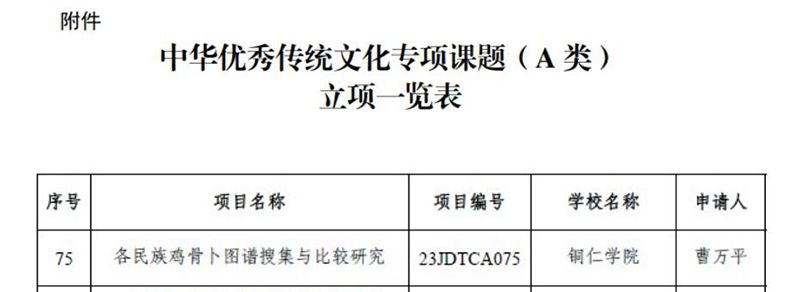 12月14日,教育部社会科学司对中华优秀传统文化专项课题(A类)的立项结果进行公示,我校曹万平教授申报的《各民族鸡骨卜图谱搜集与比较研究》获得重点项目立项支持,合同经费20万元。该项目的获立,也是世界杯官网在教育部重点项目上的首次突破。