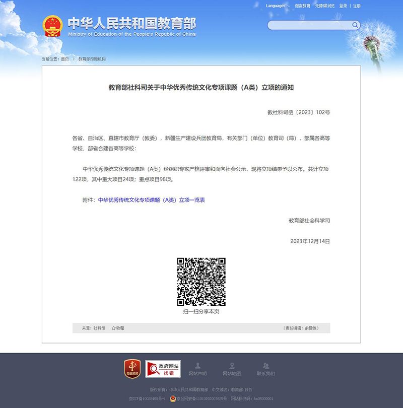 为深入学习贯彻党的二十大精神,贯彻落实习近平总书记关于弘扬中华优秀传统文化的系列重要讲话精神,特别是在文化传承发展座谈会上的重要讲话精神,推动中华优秀传统文化创造性转化、创新性发展,教育部决定设立“中华优秀传统文化专项课题”。课题分A、B两类,其中,A类由教育部社会科学司设立,参照教育部人文社会科学研究项目管理,B类由山东省哲学社会科学工作办公室设立,两类课题的组织实施工作由尼山世界儒学中心具体负责。据悉,本年度教育部社科司共接受381所高校779项申请,最终立项122项,其中重大项目24项,重点项目98项。