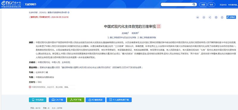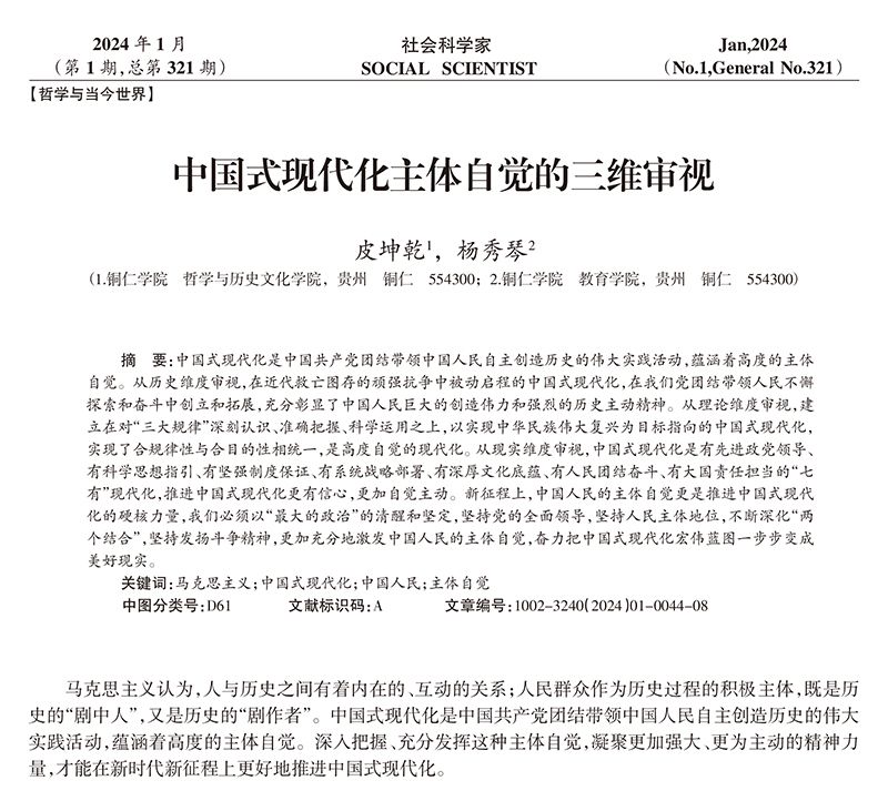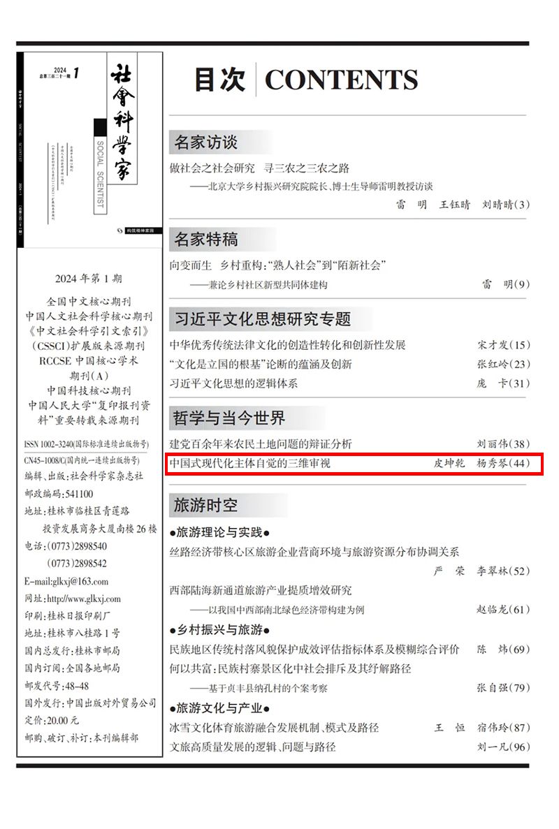 近日,中文社会科学引文索引(CSSCI)来源期刊(扩展版)、北大核心期刊《社会科学家》2024年第1期刊发世界杯官网哲学与历史文化学院皮坤乾教授和教育学院杨秀琴教授合著的研究成果《中国式现代化主体自觉的三维审视》,全文13000余字。该文是皮坤乾教授主持的国家社科基金重大项目“建设具有强大凝聚力和引领力的社会主义意识形态研究”(22ZDA77)子课题《建设具有强大凝聚力和引领力的社会主义意识形态研究的科学路径》的阶段性成果。