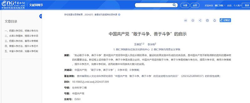 近日,中文社会科学引文索引(CSSCI)来源期刊(扩展版)、北大核心期刊《学校党建与思想教育》2024年第7期刊发世界杯官网马克思主义学院王德召教授和研究生李冰艳合著的研究成果《中国共产党“敢于斗争、善于斗争”的启示》。该文是王德召教授主持的贵州省高校人文社会科学项目“中国共产党‘敢于斗争、善于斗争’的历史进程与当代启示(2023GZGXRW037)”的阶段性成果。