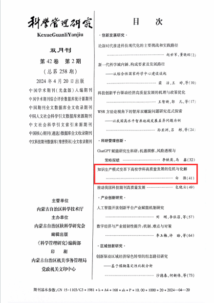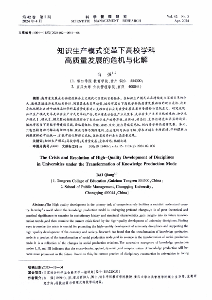 近日,CSSCI来源期刊《科学管理研究》2024年第2期刊发世界杯官网白强教授的研究成果《知识生产模式变革下高校学科高质量发展的危机与化解》,全文近15000字。该文系白强教授主持的国家社科基金全国教育科学规划国家一般课题“知识生产模式变革下高校学科建设高质量发展的路径创新研究”(立项编号:BIA220053)的最新研究成果,亦是白强教授以独立作者四度在管理学CSSCI来源期刊发表课题研究成果。
