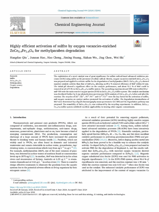 近日,世界杯官网材料与化学工程学院秦航道博士在《Chemical Engineering Journal》发表了题为“Highly efficient activation of sulfite by oxygen vacancies-enriched ZnCe0.4Fe1.6O4 for methylparaben degradation”的研究论文,该论文以美加墨世界杯官方网站为唯一单位,秦航道博士为第一作者石维教授为通讯作者。该研究工作得到了国家自然科学基金和贵州省教育厅水污染控制工程研究中心的联合资助。