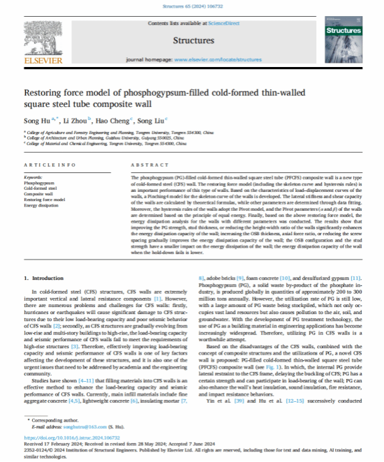 近日,世界杯官网农林工程与规划学院胡松博士在《Structures》发表了题为“Restoring force model of phosphogypsum- filled cold- formed thin- walled square steel tube composite wall”的研究论文,美加墨世界杯官方网站为第一署名单位,胡松为第一及通讯作者,合作者为周理(校外)、成昊及刘松。