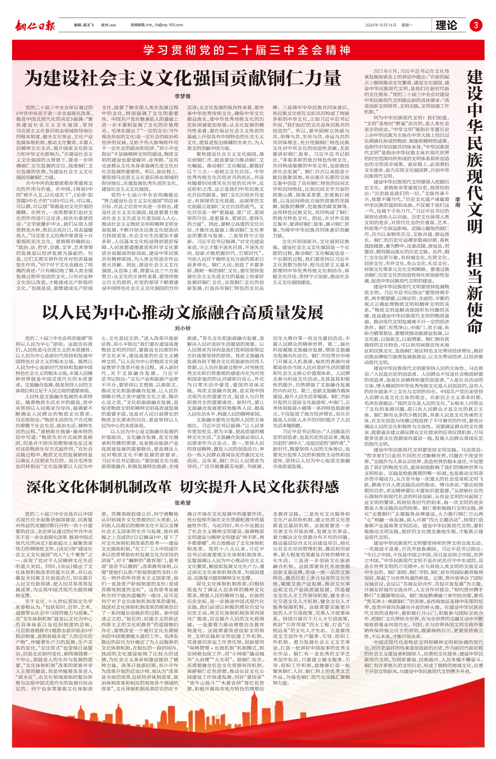 建设社会主义文化强国,是全面建设社会主义现代化国家、实现中华民族伟大复兴的重要基础和前提。四篇文章着眼于党的二十届三中全会关于建设社会主义文化强国的具体任务,围绕文化建设这一中心,以铜仁市文化发展为落脚点,分别就“文化强国建设”“建设中华民族现代文明”“文旅融合发展 ”以及“文化体制机制改革”四个主题进行理论阐释。文章坚持马克思主义理论指导地位,强调理论之经与实践之纬的交织,结合铜仁市文化发展现状与文化资源禀赋,提出针对性举措,为推动铜仁文化崛起和建设现代化绿色铜仁贡献力量。