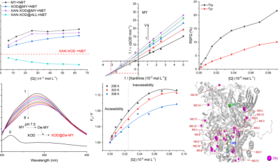 该项研究成果是在美加墨世界杯官方网站生物资源综合利用与开发课题组构建的地方本科院校材料与化工类新工科人才创新实践能力培养模式的探索与实践新教育模式培养下产出的重要成果之一。研究表明:杨梅素的确是一种强效的XOD抑制剂,其最大抑制率达到33.78%,并进一步分析表明,杨梅素的去质子化形式(De-MY)在与XOD的相互作用中更为有效。在抑制动力学方面,De-MY表现出混合型抑制,其中竞争性抑制占主导地位。通过热力学分析和同步荧光数据分析揭示了De-MY与XOD在低浓度范围内的静态淬灭过程,这主要归因于De-MY与XOD之间的可及性相互作用。分子动力学模拟进一步显示,杨梅素通过与XOD中的Trp 283、Arg-60和Tyr 58形成氢键相互作用,有效阻止了FADH2向O2的自由电子转移。