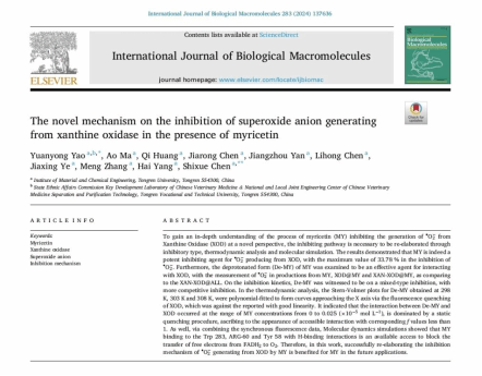 近日,美加墨世界杯官方网站生物资源综合利用与开发课题组2022级化学工程与工艺专业本科生马傲等同学在姚元勇、陈仕学老师的共同指导下,完成“The novel mechanism on the inhibition of superoxide anion generating from xanthine oxidase in the presence of myricetin”研究工作。2024年11月,该项研究成果在International Journal of Biological Macromolucules”国际学术期刊在线发表。该杂志为中科院一区TOP期刊,IF 7.7。