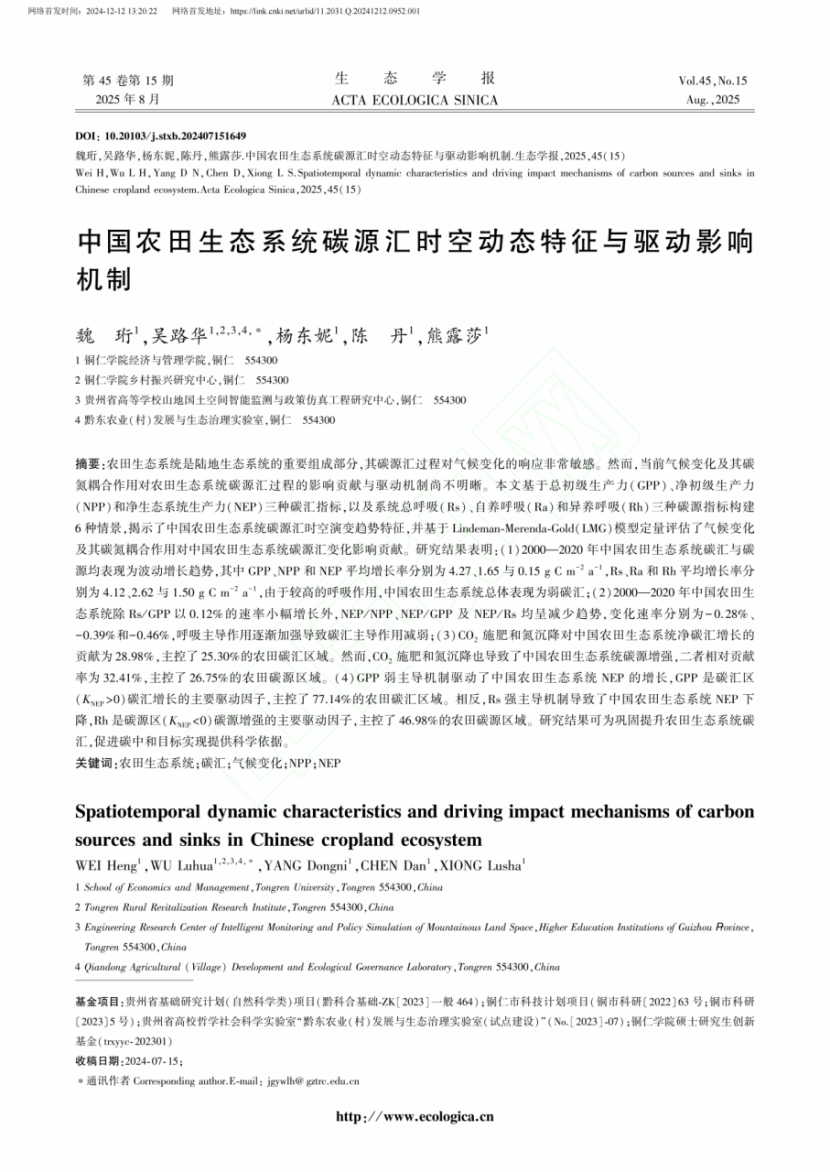 12月12日,世界杯官网2023级农村发展专业硕士研究生魏珩在国家一级学报《生态学报》(国家卓越期刊)上发表学术论文《中国农田生态系统碳源汇时空动态特征与驱动影响机制》(网络首发)。世界杯官网经济管理学院作为第一署名单位,硕士研究生魏珩为第一作者,吴路华博士为通讯作者。合著作者包括2024级农村发展专业硕士研究生杨东妮、陈丹和熊露莎。