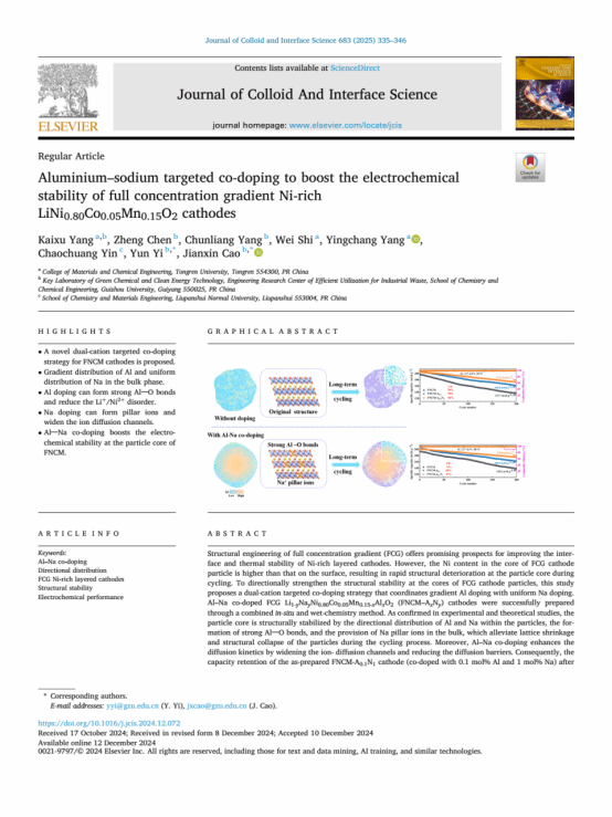 近日,世界杯官网材料与化学工程学院先进能源材料与器件课题组杨凯旭博士在《Journal of Colloid and Interface Science》(中科院一区,IF=9.4)发表了题为“Aluminium–sodium targeted co-doping to boost the electrochemical stability of full concentration gradient Ni-rich LiNi0.80Co0.05Mn0.15O2 cathodes”的研究论文,美加墨世界杯官方网站为第一署名单位。