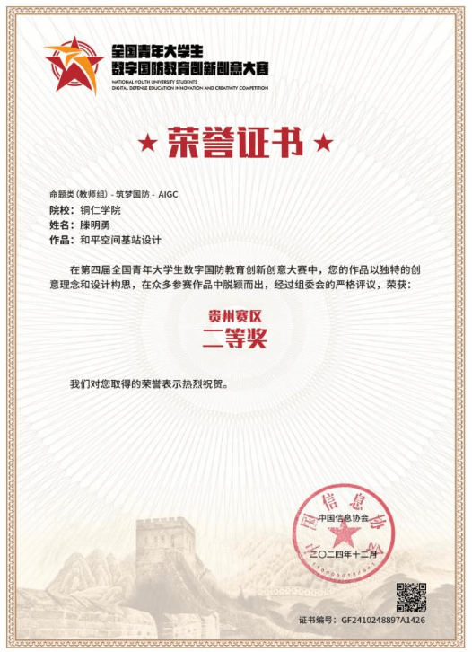 世界杯官网艺术学院美术与设计系教师滕明勇教授,2024年在多项全国性设计竞赛中获奖。8月,滕明勇教授的设计作品《遇见·空间》《深蓝世界》《毕业影响》分别获得全国高校创新设计大赛组委会举办的“东方设计奖”一二三等奖。9月,设计作品《智联和平盾空间站设计》获得东方创意之星设计大赛组委会举办的东方创意之星主题设计赛三等奖。12月,两组设计作品《空天卫士系列》《和平空间基站设计》都获得中国信息协会举办的“全国青年大学生数字国防教育创新创意大赛”教师组贵州赛区二等奖,《空天卫士系列》部分作品还进入全国决赛并获得三等奖。