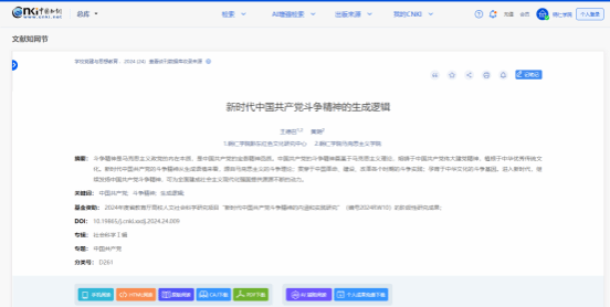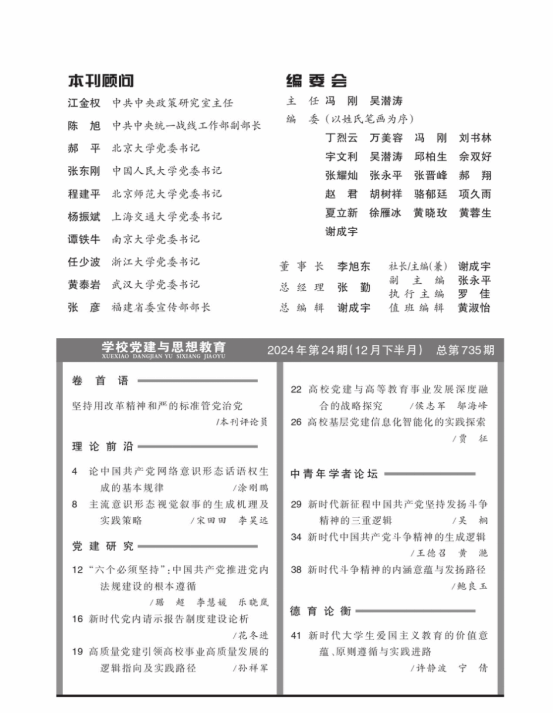 近日,中文社会科学引文索引(CSSCI)来源期刊(扩展版)、北大核心期刊《学校党建与思想教育》2024年第24期刊发了世界杯官网马克思主义学院王德召教授和研究生黄滟合著的研究成果《新时代中国共产党斗争精神的生成逻辑》。该文是贵州省高校人文社会科学项目“新时代中国共产党斗争精神的内涵和实践研究”(编号2024RW10)的阶段性研究成果。