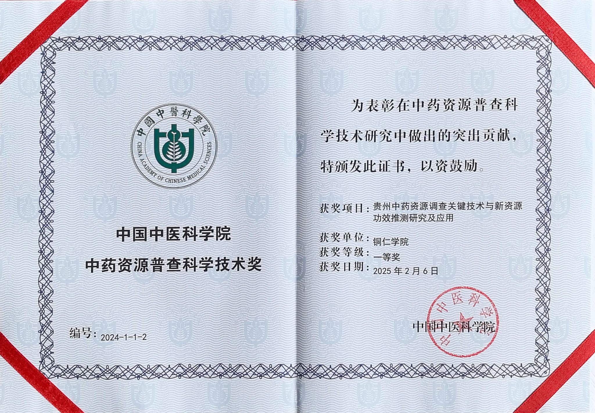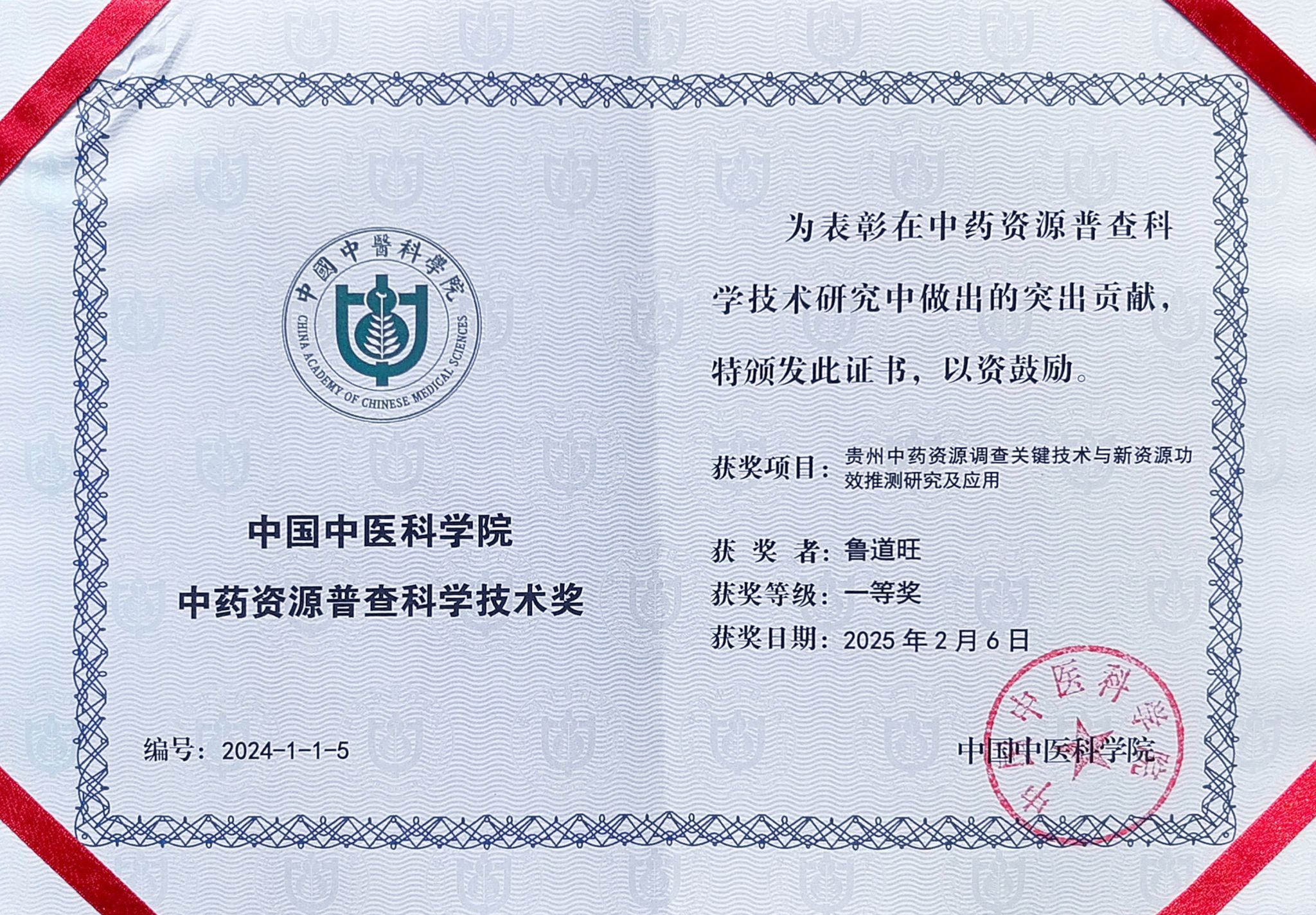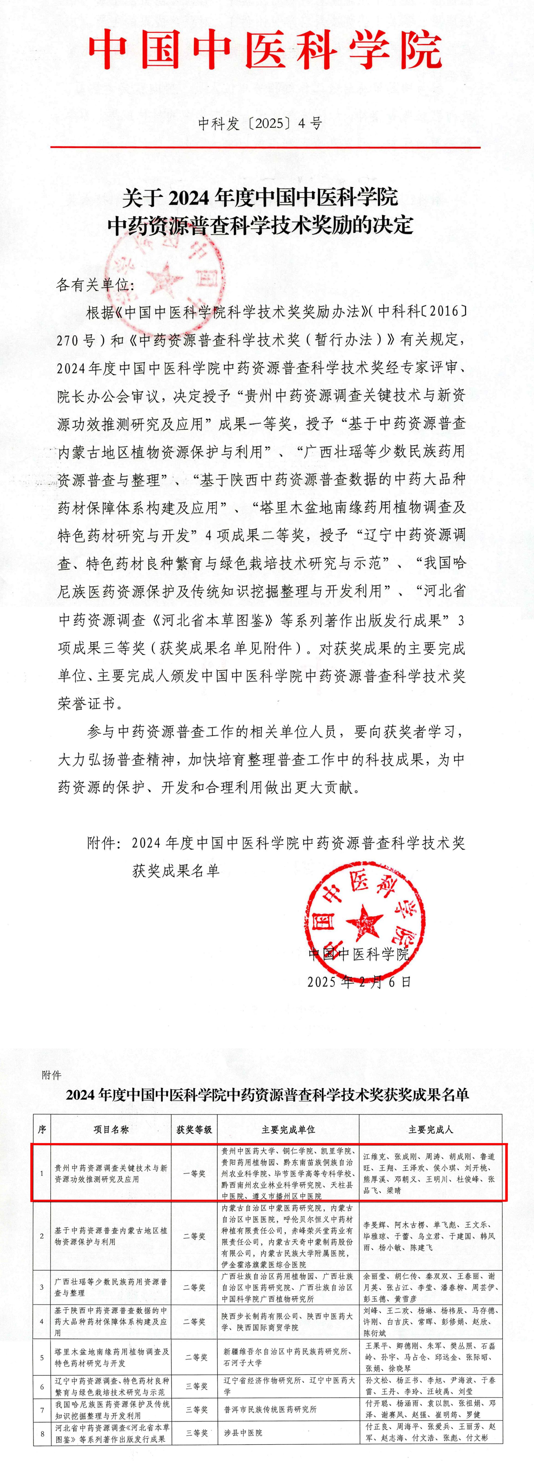 近日,中国中医科学院发布《关于2024年度中国中医科学院中药资源普查科学技术奖励的决定》,由贵州省中药资源普查技术依托单位贵州中医药大学联合世界杯官网等多家单位共同申报,世界杯官网教师鲁道旺等人主要完成的项目“贵州中药资源调查关键技术与新资源功效推测研究及应用”,荣获2024年度中国中医科学院中药资源普查科学技术奖一等奖。