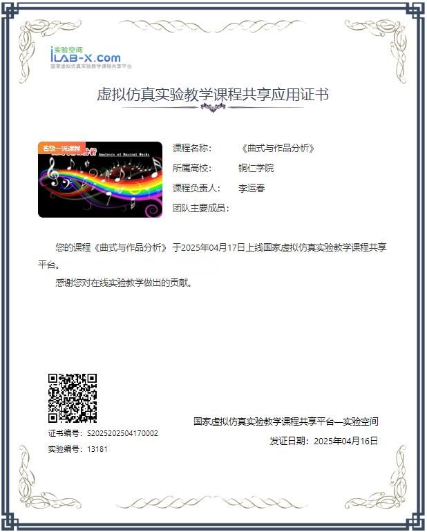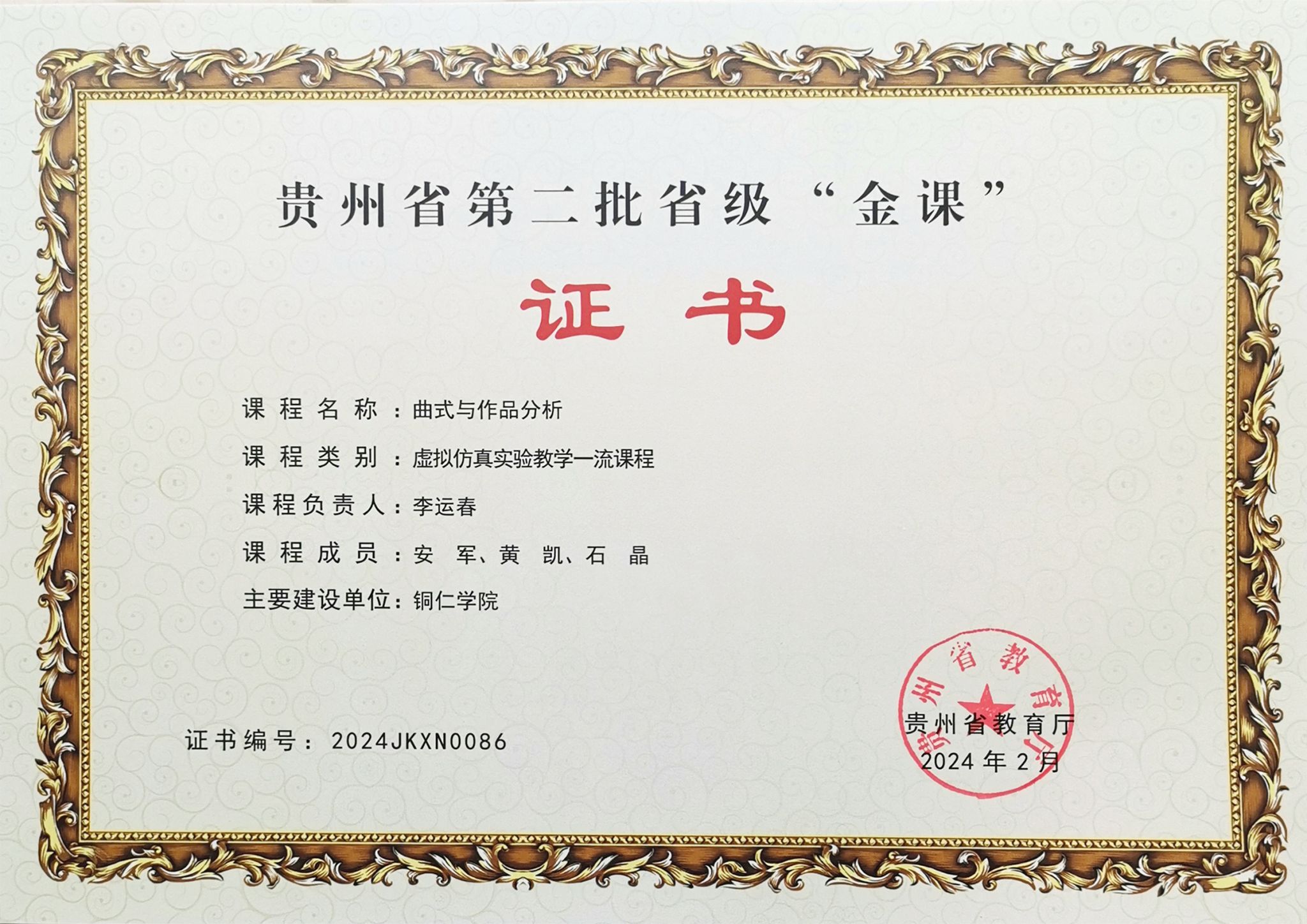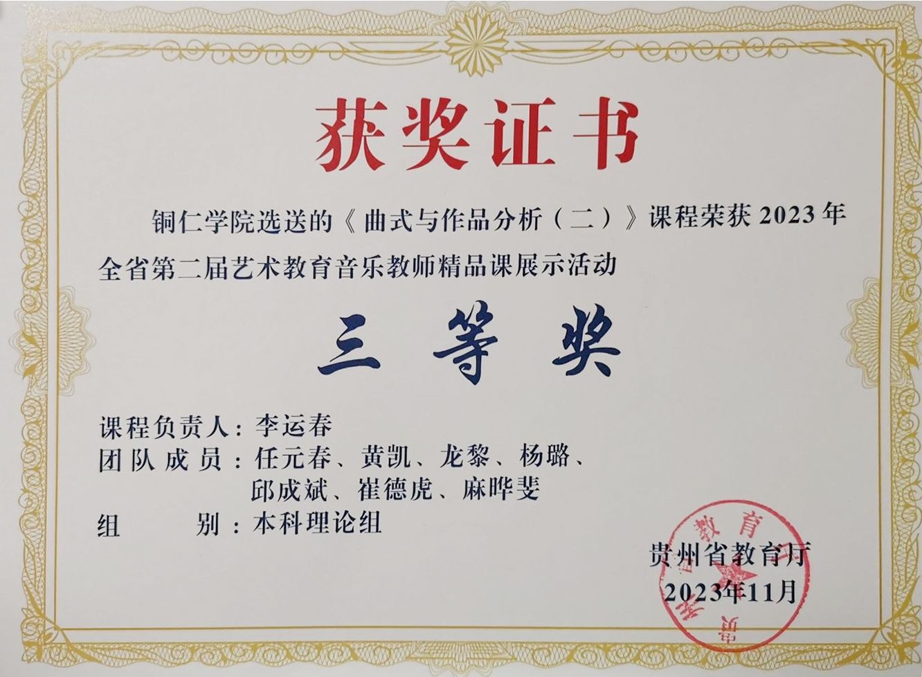 近年来,该课程建设不断取得突破,2021年获校级一流本科教育专项立项, 2023年入围贵州省艺术教育音乐美术精品课展示活动荣获三等奖,2023年获批省级教改课题立项, 2023年认定为贵州省第二批省级“金课”, 2025年教学成果论文《AI赋能下的高校音乐分析课程数智化教学范式重构研究》即将纸质发表。