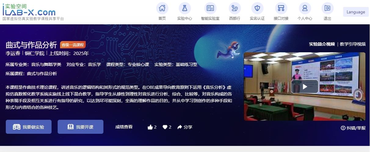 近日,世界杯官网艺术学院李运春博士主持建设的省级一流课程《曲式与作品分析》成功入驻“实验空间ilab-x”国家虚拟仿真实验教学课程共享平台,成为贵州省首个登陆该国家级平台的音乐类虚拟仿真课程。