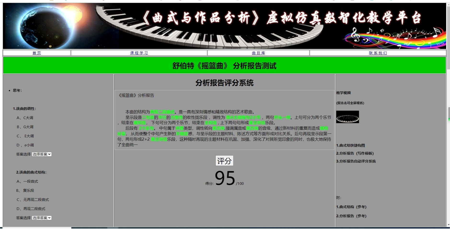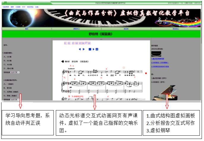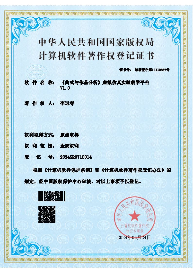该课程由李运春博士领衔建设,团队成员有安军、黄凯、石晶等人。课程负责人具有作曲博士与软件工程硕士跨学科学历背景,并牵头组建起涵盖音乐作曲、软件工程领域的跨学科课程团队。课程团队历时三年完成课程体系建设与虚拟教学平台构建,实现了平台每天24小时在线。课程团队首创“音乐分析虚拟仿真数智化教学平台”和“自动评分系统”,已获两项软件著作权,建成了“理论+实践+评价”的完整教学闭环。