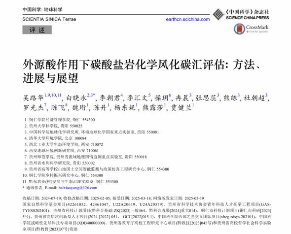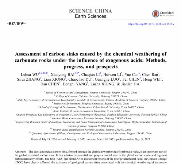 5月19日,世界杯官网经济管理学院吴路华教授在国际权威期刊《Science China Earth Sciences》和《中国科学:地球科学》(中科院1区Top SCI,IF=6)同时在线发表题为《Assessment of carbon sinks caused by the chemical weathering of carbonate rocks under the influence of exogenous acids: Methods, progress, and prospects》与《外源酸作用下碳酸盐岩化学风化碳汇评估:方法、进展与展望》的2篇研究论文。该论文一刊双版(中文版与英文版),由吴路华教授作为唯一第一作者,中国科学院地球化学研究所白晓永研究员为唯一通讯作者,联合贵州大学、清华大学、西北工业大学等多家科研机构共同完成。