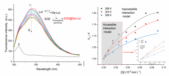 该研究是依托课题组构建的地方本科院校材料与化工类新工科人才创新实践能力培养体系”,是该教育模式下产出的一重要成果。研究聚焦于类黄酮抑制剂木犀草素及其类似物对黄嘌呤氧化酶(Xanthine oxidase, XOD)活性的抑制机制,为功能食品的开发提供了一个新的视角。研究结果表明,木犀草素及其类似物去质子化成的酚类物质是有效的抑制剂,对XOD产生的超氧化物有不同程度的影响。在热力学分析中,不同温度下F0/F与[Q]的Stern-Volmer图未能证明多项式-线性拟合,而是在不同程度上接近x轴,这偏离了预期的良好线性关系提示抑制的热力学可能与浓度有关。在较低浓度下,抑制剂与酶形成的基态复合物以静态荧光猝灭为主,表现出良好的线性拟合;而高浓度下呈现出非接触型作用机制,反映为猝灭强度减弱的非线性特征。此外,抑制动力学研究表明,木犀草素类化合物表现出浓度依赖的混合型抑制模式(兼具竞争性和非竞争性特征)。同步荧光分析与分子对接结果进一步证实了抑制剂与XOD之间存在特异性相互作用。该研究在深入阐释抑制机制的基础上,拓展了黄酮类天然产物作为XOD抑制剂的潜在应用价值。