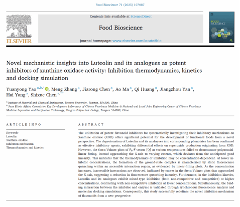 2025年6月,世界杯官网材料与化学工程学院生物资源综合利用与开发课题组在国际Top期刊《Food Bioscience》(Q1,影响因子5.9)发表题为“Novel mechanistic insights into Luteolin and its analogues as potent inhibitors of xanthine oxidase activity: Inhibition thermodynamics, kinetics and docking simulation”的研究论文。该论文工作由化学工程与工艺专业2021、2022、2023级本科生陈佳荣、马傲、黄琪、晏江洲在姚元勇、陈仕学两位老师的指导下共同完成,充分展示了世界杯官网本科生在科研创新与实践方面的突出能力