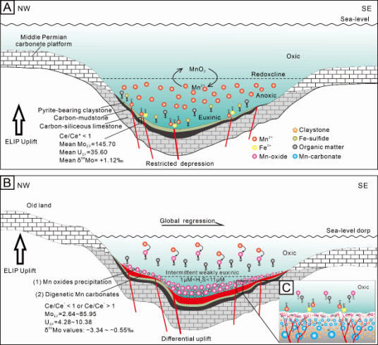 针对上述问题,世界杯官网徐海博士(第一作者)与中国科学院地球化学研究所尹润生研究员(通讯作者)、贵州大学资源与环境工程学院高军波教授和杨瑞东教授、美加墨世界杯官方网站徐进鸿博士等合作,对贵州遵义二叠纪锰矿床(图1)开展了系统的地质、地球化学和C-S-Mo同位素研究,厘定了遵义锰矿中碳酸锰矿物的沉淀机制,重建了锰质沉淀过程中盆地水体氧化还原结构的动态演变细节及控制因素,建立了海退+地壳隆升驱动盆地水体氧化还原界面向下扩张触发锰质大规模沉淀和矿化的成矿模式。在此基础上结合更广泛地质历史时期沉积锰矿沉淀途径的相关证据,提出地质历史时期沉积碳酸锰矿是古海洋由缺氧条件向氧化条件转变的产物,可以作为古海洋氧化还原波动的有力指标,其形成与同时期海洋氧化还原扰动有密切的成因联系。