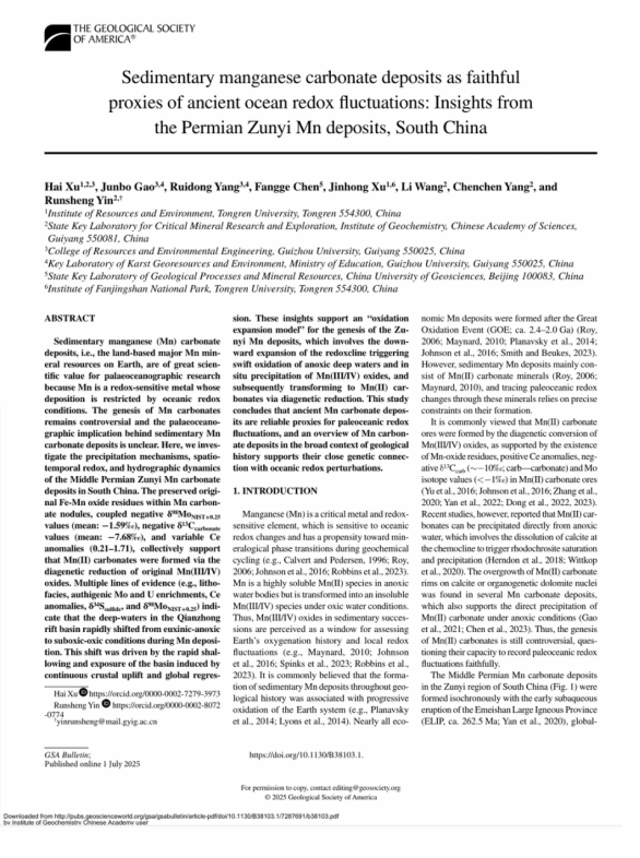 近日,世界杯官网徐海博士在国际顶级地学期刊(SCI一区TOP期刊)《Geological Society of America Bulletin》(美国地质学会会刊,简称GSA Bulletin)上发表了题为《Sedimentary manganese carbonate deposits as faithful proxies of ancient ocean redox fluctuations: Insights from the Permian Zunyi Mn deposits, South China》的最新研究成果,为限定沉积碳酸锰矿沉淀机制及其与古海洋氧化还原扰动之间的潜在关联提出了新的认识。