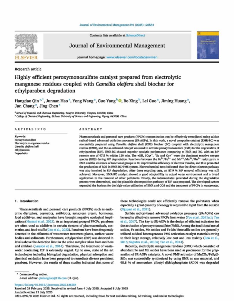 1)将电解锰渣(EMR)与油茶壳生物炭(BC)进行复合,制备出EMR-BC复合催化剂,用于活化过硫酸盐降解水中的对羟基苯甲酸乙酯(EtP,常用于防腐剂和食品添加剂),结果表明EMR-BC复合催化剂的催化活性比EMR和BC均高,在最佳工艺条件下,反应120min,EtP的去除率高达97.5%。该研究对EMR-BC催化剂的活性位点进行了识别,并对过硫酸盐的活化机理进行了研究。该研究成果以“Highly efficient peroxymonosulfate catalyst prepared from electrolytic manganese residues coupled with Camellia oleifera shell biochar for ethylparaben degradation”为题发表于环境领域权威期刊Journal of Environmental Management(SCI二区top期刊)。