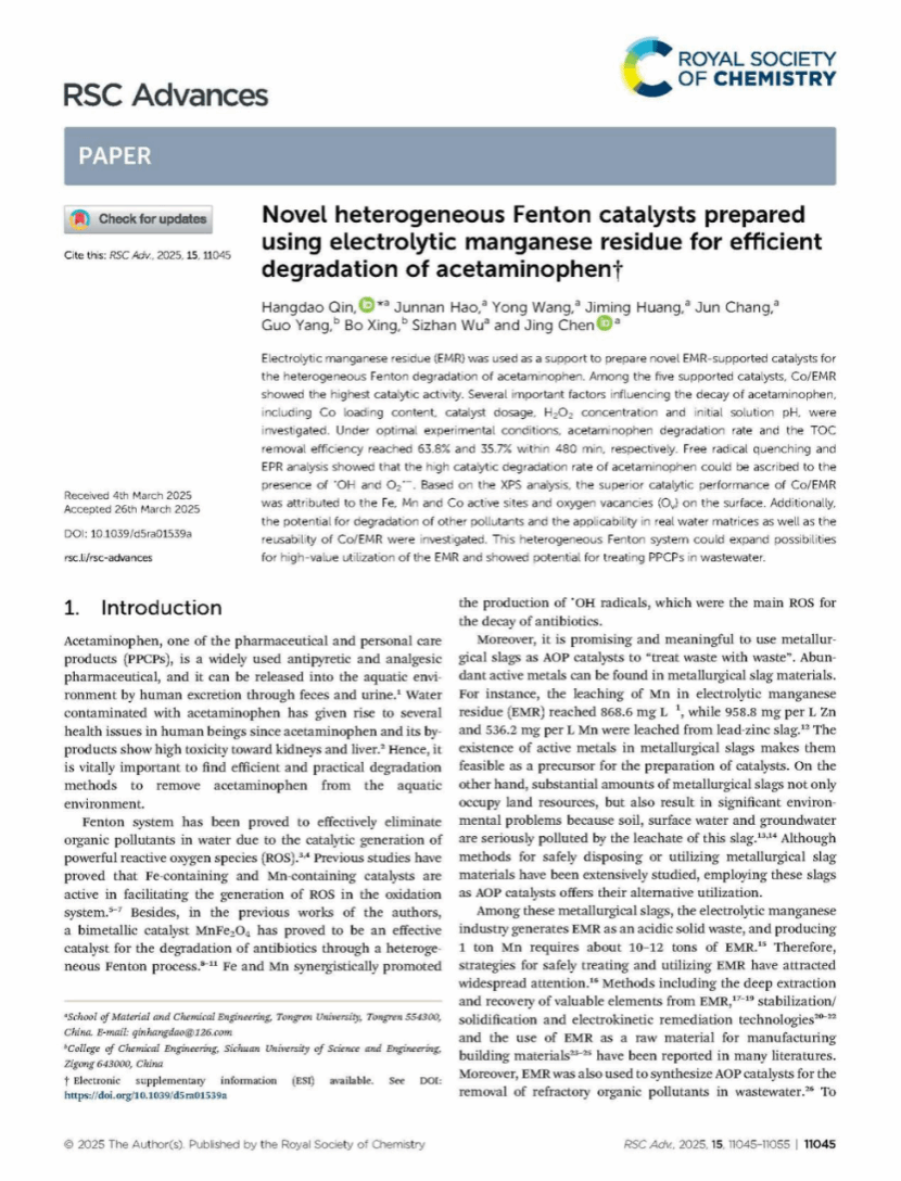 2)将电解锰渣作为载体负载钴的氧化物制备出Co/EMR负载型催化剂,并将其用于非均相Fenton降解水中的对乙酰氨基酚(一种常见的止痛药),对体系中产生的活性氧物种进行了分析,并对催化机理进行了深入探讨。该研究成果以Novel heterogeneous Fenton catalysts prepared using electrolytic manganese residue for efficient degradation of acetaminophen为题发表于化学综合期刊RSC Advances。