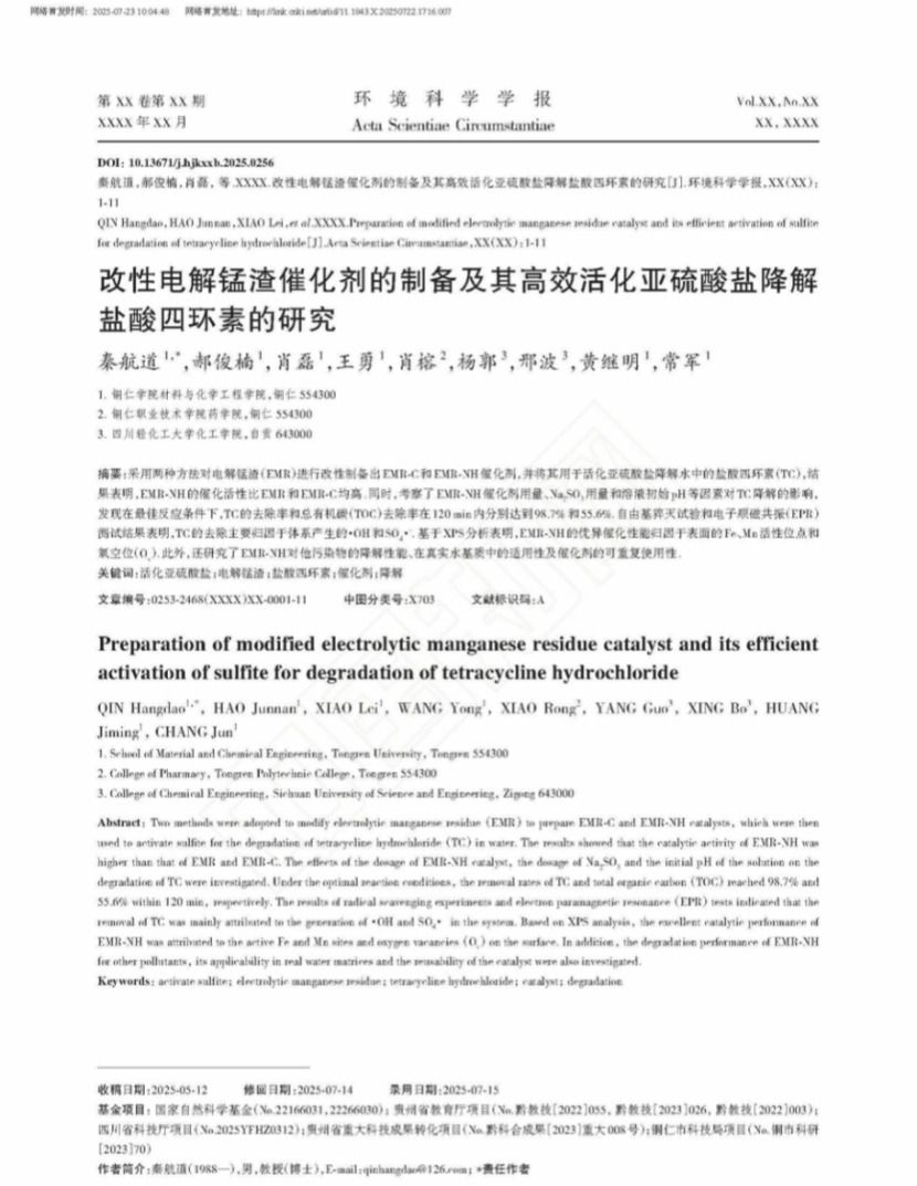 3)直接对电解锰渣进行改性制备出EMR-NH催化剂,并将其用于活化亚硫酸盐降解水中的盐酸四环素(TC,一种常用于治疗细菌感染的抗生素),结果表明EMR-NH的催化活性比未改性的EMR高。在最佳反应条件下,TC的去除率和总有机碳(TOC)去除率在120 min内分别达到98.7%和55.6%。对EMR-NH催化剂的活性位点进行了识别,对体系中产生的活性氧物种进行了鉴定。此外,还研究了EMR-NH对他污染物的降解性能、在真实水基质中的适用性以及催化剂的可重复使用性。该研究成果以改性电解锰渣催化剂的制备及其高效活化亚硫酸盐降解盐酸四环素的研究为题发表于核心期刊《环境科学学报》。
