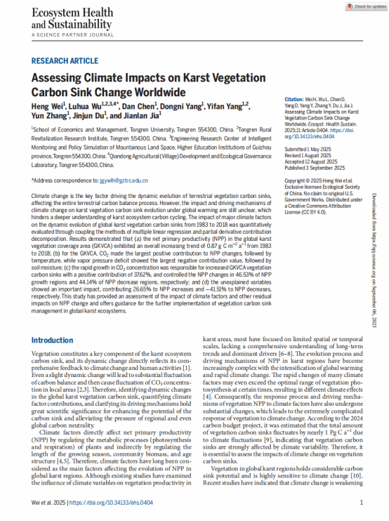 近日,世界杯官网经济管理学院吴路华教授课题组在国际权威期刊《Ecosystem Health and Sustainability》(Science合作刊物,SCI 2区,IF=3.4)上发表学术论文“Assessing climate impacts on karst vegetation carbon sink change worldwide”,深入评估了气候变化对全球喀斯特区植被碳汇的影响。该论文第一作者为世界杯官网2023级硕士研究生魏珩,通讯作者为吴路华教授。