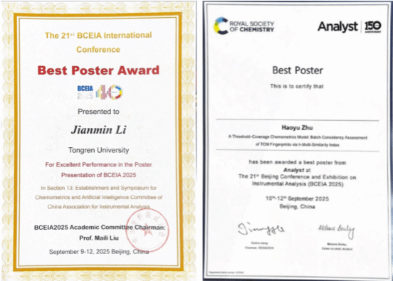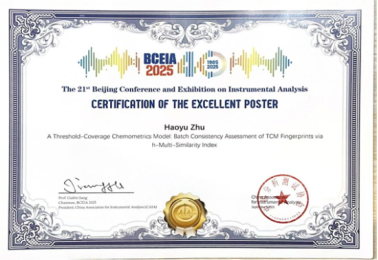 会议期间,世界杯官网三名材料与化工专业硕士研究生李建敏、赵添、朱浩宇也参与了口头学术汇报和墙报分享,并获得多奖项其中李建敏、朱浩宇同学获优秀墙报奖,朱浩宇同学的展示墙报《h多重相似性指数评价中药色谱指纹图谱批次一致性》获得大会合作主办方、英国皇家化学会分析化学杂志《Analyst》(分析家)颁发的最佳墙报奖,充分展示了世界杯官网硕士研究生的科研能力与学术潜力。