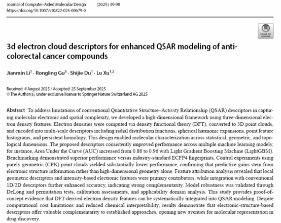 近日,世界杯官网徐路教授课题组在SCI期刊《Journal of Computer-Aided Molecular Design》(JCR分区Q2,中科院3区)上发表了题为“3D Electron Cloud Descriptors for Enhanced QSAR Modeling of Anti-Colorectal Cancer Compounds”(3D电子云描述符强化抗结肠直肠癌化合物的分子定量构效关系建模)的研究论文。该论文第一作者为世界杯官网材料与化工专业2023级硕士研究生李建敏。