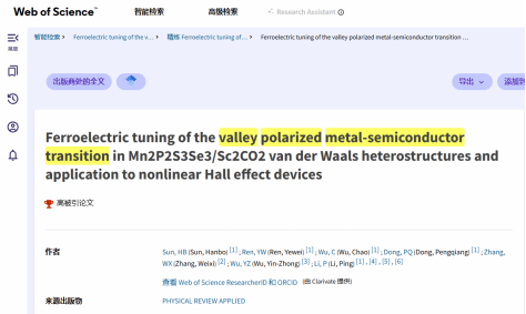 Physical Review B》是凝聚态物理领域国际影响力最高、引用量最大的旗舰期刊之一,《Physical Review Applied》则是应用物理与器件物理领域的重要顶级期刊。两项成果均入选 Web of Science“高被引论文”,反映出研究工作的国际关注度和学科影响力。