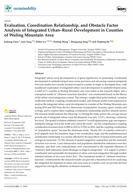 上述研究成果得到国家自然科学基金(42362014)、贵州省基础研究(自然科学)项目(黔科合基础-ZK[2023]一般461)、贵州省教育厅工程研究中心项目(黔教技[2023]045号)及美加墨世界杯官方网站博士人才启动基金(tyxyDH2218)的联合资助,标志着世界杯官网在山地城乡可持续发展领域的科研实力获得国际认可。