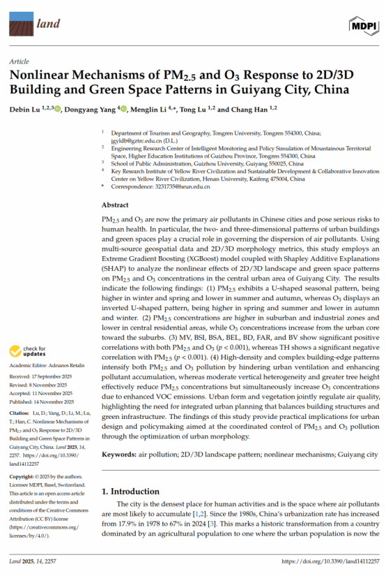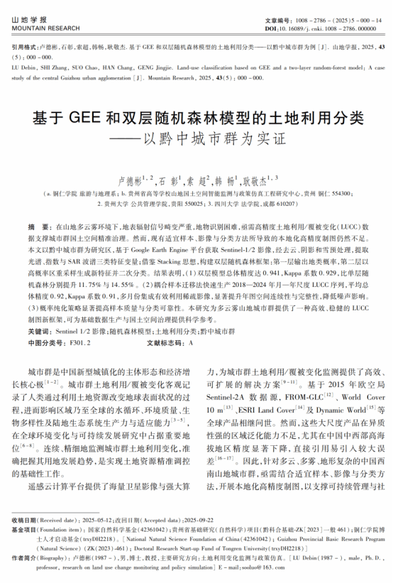 据悉,该团队相关成果连续发表于国际知名期刊,其中发表于《Sustainability》(SCI/SSCI双检索,JCR Q2分区)的成果以“Evaluation, Coordination Relationship, and Obstacle Factor Analysis of Integrated Urban–Rural Development in Counties of Wuling Mountain Area”为题,世界杯官网硕士研究生陈家恒为第一作者,卢德彬教授为通讯作者;发表于《Land》(SSCI,JCR Q2分区)的成果以“Nonlinear Mechanisms of PM2.5 and O3 Response to 2D/3D Building and Green Space Patterns in Guiyang City, China”为题,卢德彬教授为第一作者;发表于《山地学报》(北大核心,中国山地科学研究领域唯一权威期刊)的成果以“基于GEE和双层随机森林模型的土地利用分类—以黔中城市群为实证”为题,卢德彬教授为第一作者。