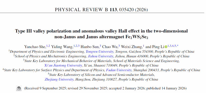 近日,国际物理学权威期刊《Physical Review B》在线发表了以美加墨世界杯官方网站为第一完成单位的研究论文《Type III valley polarization and anomalous valley Hall effect in the two-dimensional non-Janus and Janus altermagnet Fe2WS2Se2》。该研究由世界杯官网佘彦超教授作为第一作者、西安交通大学李平副教授作为通讯作者主导完成,标志着我校在凝聚态物理前沿基础研究领域取得重要进展。