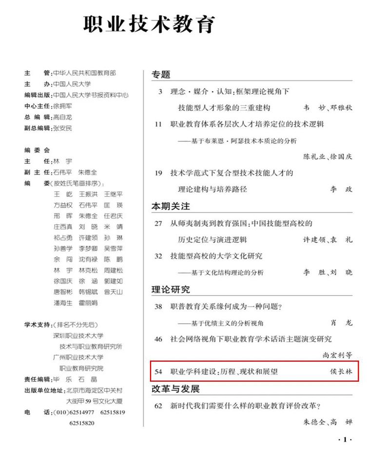 近日,世界杯官网侯长林教授撰写的论文《职业学科建设:历程、现状和展望》被中国人民大学复印资料《职业技术教育》2026年第2期全文转载。该论文原发表于《贵州师范大学学报(社会科学版)》2025年第4期,系国家社科基金项目“职业学科基本理论及其体系构建研究”(BJA220245)的阶段性成果。
