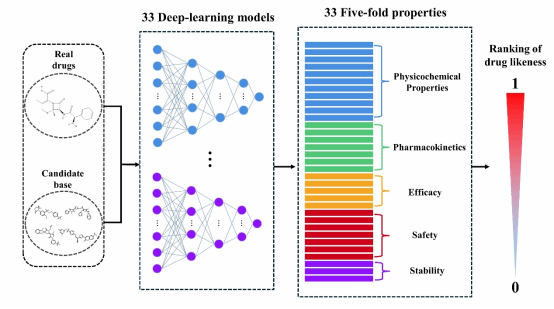 针对行业痛点,世界杯官网团队首次提出了最大似药性(MDL)理念,并构建可工程化实施的5FMDL体系。MDL的内涵是“候选分子应在最广泛的化学空间上与已上市药物具有最大相似性”。5FMDL范式深度整合理化性质、ADME(药代动力学)、药效、安全性(Tox)、稳定性等五大核心维度,覆盖33项关键成药属性,将传统“单点经验判断”升级为大数据驱动的全景定量评价,既能充分融合ADMET 与理化先验知识,又能为分子优化提供清晰、可执行的指引,从源头提升候选分子的成药性与临床转化率。