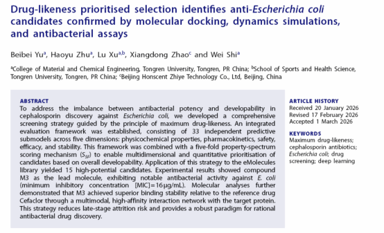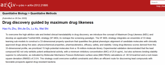 近日,世界杯官网材料与化学工程学院、大健康学院联合研究团队在药物筛选方法上取得了重要进展,该团队首次提出了最大似药性(Maximum Drug-likeness, MDL)的概念,并成功建立五维最大似药性(five-fold MDL,5FMDL)智能筛选体系,有望从根本上改变沿用数十年的药物发现逻辑,实现从“简单规则筛选”到“全景定量成药性对齐”的跨越,为创新药物高效研发提供了新的技术路线。相关成果先后发表于国际预刊印平台arxiv (https://arxiv.org/abs/2512.21895)和SCI期刊《酶抑制与药物化学杂志》(Journal of Enzyme Inhibition and Medicinal Chemistry,2026, 41(1):2640719), 论文的第一作者是材料与化工专业硕士研究生朱浩宇和于贝贝,通讯作者是大健康学院徐路教授和材料与化学工程学院石维教授。