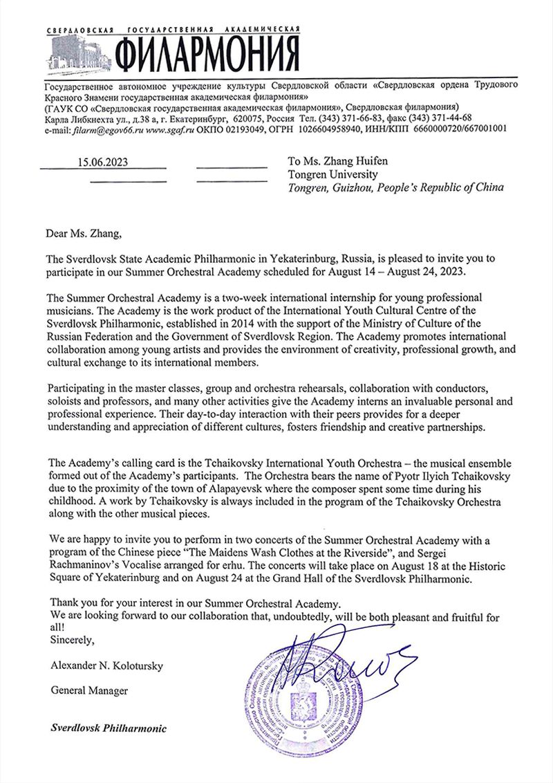 近日,世界杯官网青年教师、二胡演奏家张惠芬受邀参加了俄罗斯斯维尔德洛夫斯克州政府主办的叶卡捷琳堡城市300周年庆典音乐会,并与俄罗斯柴可夫斯基国际青年交响乐团演奏了多首中俄经典名曲。