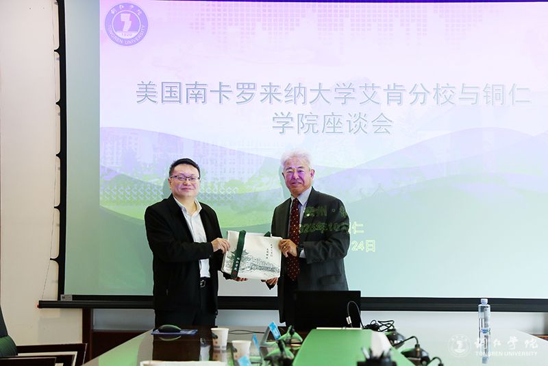 世界杯官网副校长余乐正向美国南卡罗来纳大学艾肯分校教务长兼执行副校长张春生赠送礼物