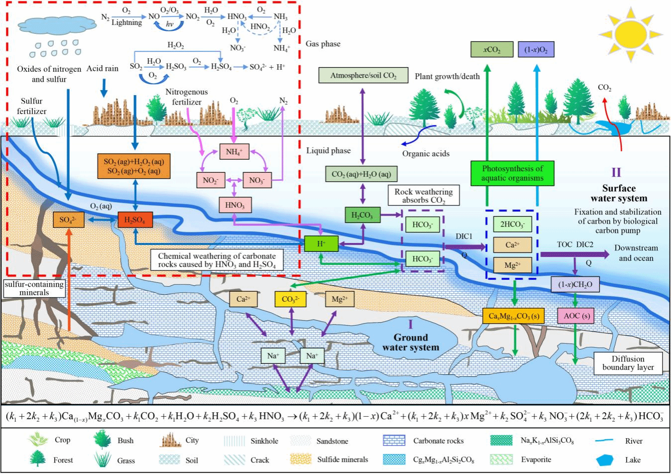 1 HNO3H2SO4H2CO3混合影响与多源岩性背景下碳酸盐岩化学风化吸收大气/土壤CO2概念模型