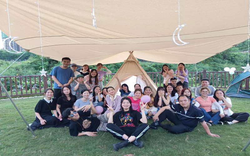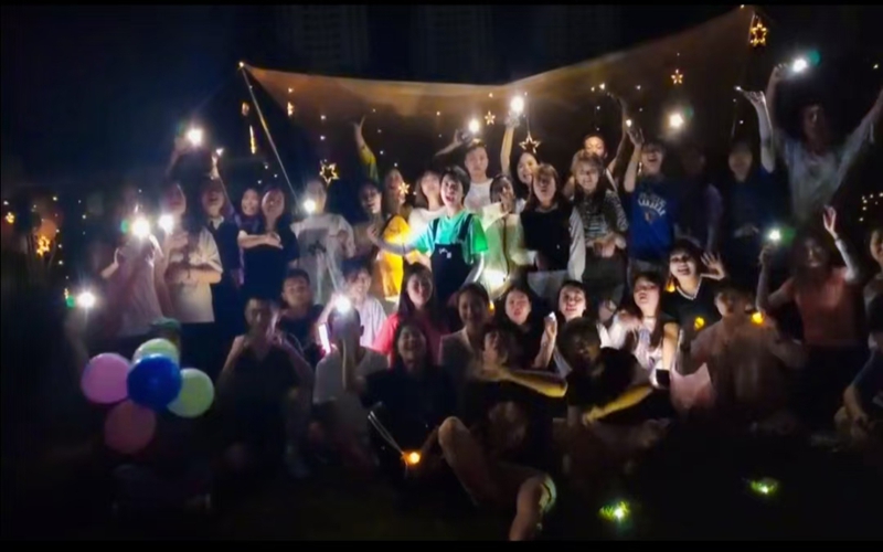课程开始前,同学们都在积极地加入到营地的组建中来,吹气球、搭帐篷、挂彩灯、采购物资等,他们各司其职,将此次活动的场地装饰得尤其美丽,有营地该有的感觉。课程开始,由主持人涂富伟同学组织活动开展,开场时候,全班同学唱了一首红歌《国家》。在翟玉胜老师的指导下,陈永莲同学运用起了热门的抖音直播方式进行直播,增加了本次活动的曝光度。旁边的同学用手机打灯光,以营造更好的氛围,由黄维丽等同学带来了热舞“爱的恰恰”作为开场舞,同学们热情空前高涨,气氛组用泡泡机吹起了泡泡,其他的同学就用手机打灯光,以营造良好的氛围,直播间的观众也越来越多,同时还引来了其他院校许多同学的参观。活动开始到一半时,突然停电了,但是同学们的热情丝毫不减,全体同学都用自己的手机打起了灯光,在“人造灯”的灯光下,又开展了“方寸空间”、“摆出英语单词造型”以及“传递成语”等小游戏。最后,由班委牵头,每个人分享自己对班级的建议,开展起了星空交谈美食会。