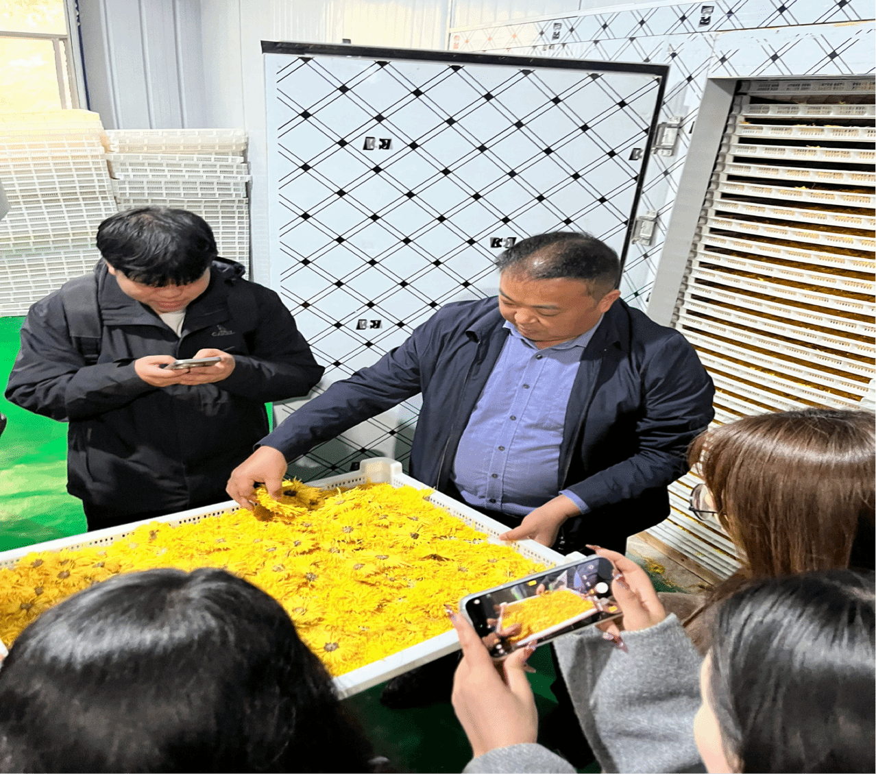 务工群众告诉我们:“我以前是在外省打工,现在老人老了,娃娃还小,就回家来带孩子和照顾老人。我们这个花是每个季节都要种的,有草就拔草,该挖地就挖地,该收花就收花,这几个月都算稳定的。”马副书记更是热情地带领大家参观了公司的产品加工车间,并赠与大家成品包装的金丝皇菊想让大家一并品味菊的芬芳和韵味。