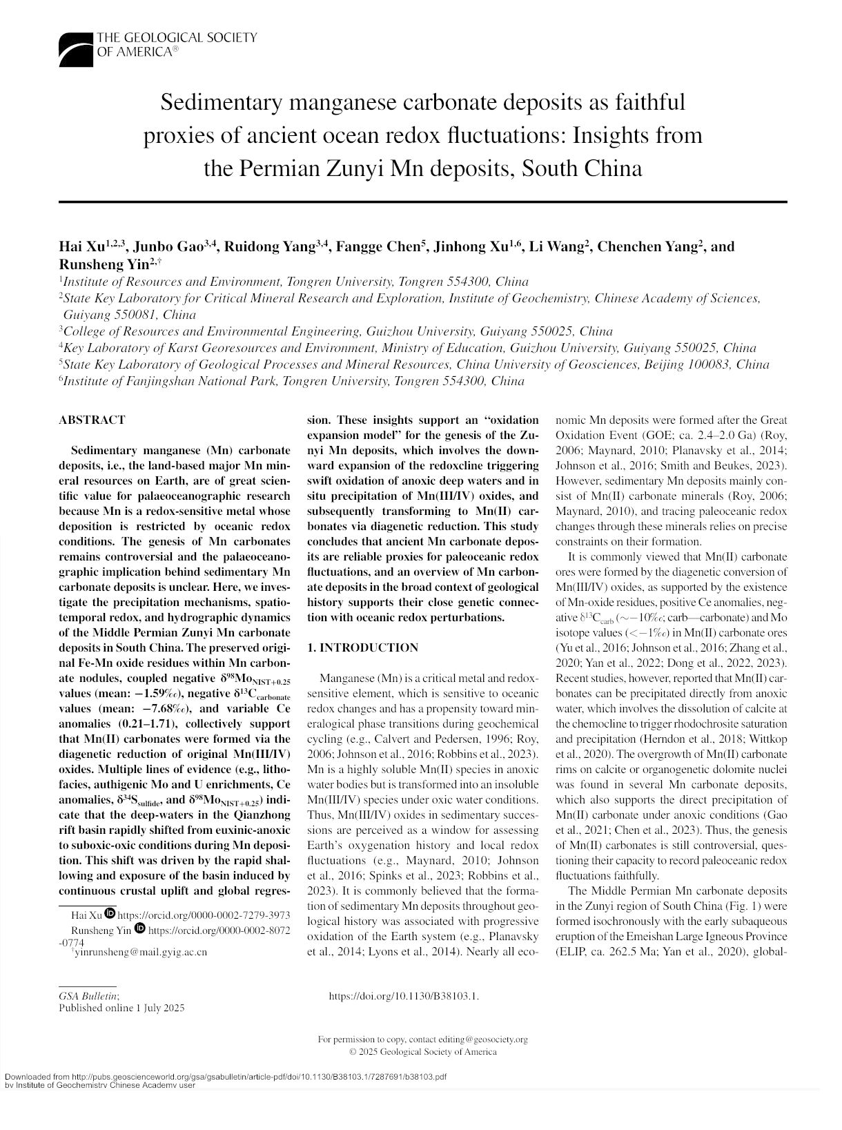 近日,我院徐海博士在国际顶级地学期刊(SCI一区TOP期刊)《Geological Society of America Bulletin》(美国地质学会会刊,简称GSA Bulletin)上发表了题为《Sedimentary manganese carbonate deposits as faithful proxies of ancient ocean redox fluctuations: Insights from the Permian Zunyi Mn deposits, South China》的最新研究成果,为限定沉积碳酸锰矿沉淀机制及其与古海洋氧化还原扰动之间的潜在关联提出了新的认识。