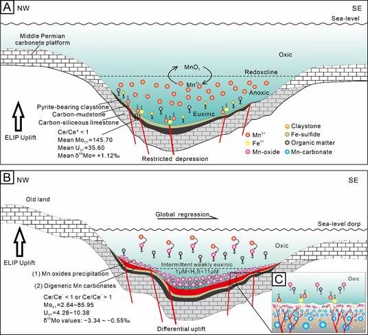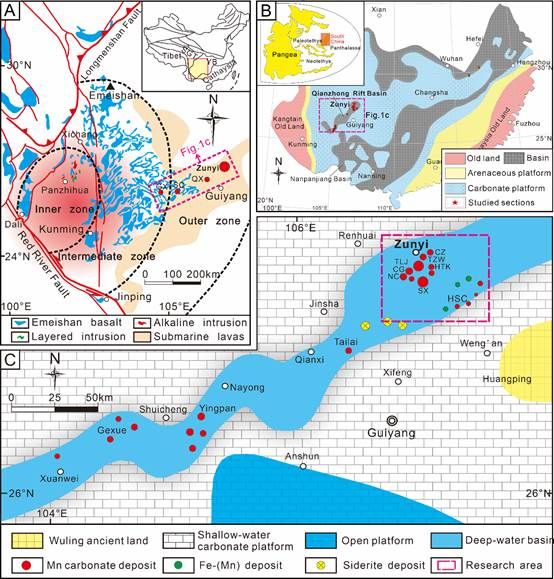 针对上述问题,美加墨世界杯官方网站徐海博士(第一作者)与中国科学院地球化学研究所尹润生研究员(通讯作者)、贵州大学资源与环境工程学院高军波教授和杨瑞东教授、美加墨世界杯官方网站徐进鸿博士等合作,对贵州遵义二叠纪锰矿床(图1)开展了系统的地质、地球化学和C-S-Mo同位素研究,厘定了遵义锰矿中碳酸锰矿物的沉淀机制,重建了锰质沉淀过程中盆地水体氧化还原结构的动态演变细节及控制因素,建立了海退+地壳隆升驱动盆地水体氧化还原界面向下扩张触发锰质大规模沉淀和矿化的成矿模式。在此基础上结合更广泛地质历史时期沉积锰矿沉淀途径的相关证据,提出地质历史时期沉积碳酸锰矿是古海洋由缺氧条件向氧化条件转变的产物,可以作为古海洋氧化还原波动的有力指标,其形成与同时期海洋氧化还原扰动有密切的成因联系。