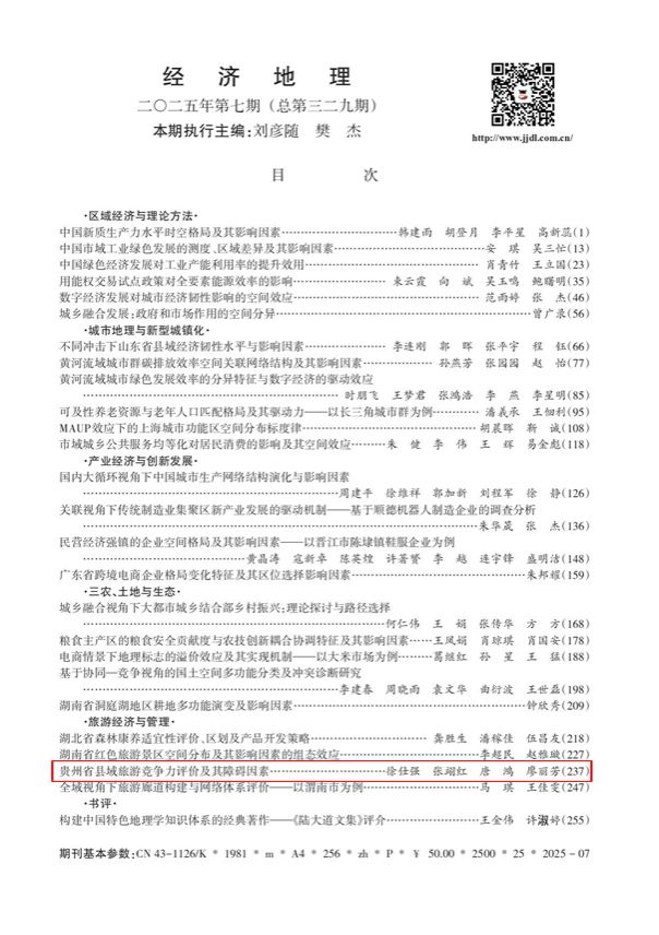 近日,我院徐仕强教授的研究论文《贵州省县域旅游竞争力评价及障碍因素》在《经济地理》2025年第7期刊发。该期刊主要刊载中国人文经济地理学科中具有探索性、前沿性和创新性的高水平论文,是CSSCI来源期刊、CSCD来源期刊、AMI核心期刊、北大核心期刊,并入选了中国科技期刊卓越行动计划,最新复合影响因子8.835。