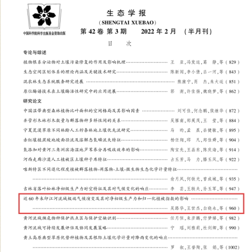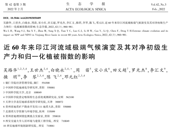 近期,世界杯官网经济管理学院吴路华副教授以第一作者在国家卓越期刊(美加墨世界杯官方网站A类)《生态学报》2022年第3期发表论文《近60年来印江河流域极端气候演变及其对净初级生产力和归一化植被指数的影响》。