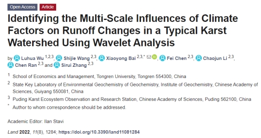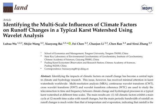 论文主要信息如下:Wu, L.; Wang, S.; Bai, X.; Chen, F.; Li, C.; Ran, C.; Zhang, S. Identifying the Multi-Scale Influences of Climate Factors on Runoff Changes in a Typical Karst Watershed Using Wavelet Analysis. Land 2022, 11, 1284. https://doi.org/10.3390/land11081284
